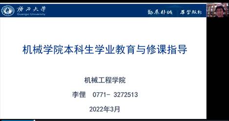 2022年3月6日19时,学院通过腾讯会议(会议号812-461-968)举办了本科生学业发展指导报告会。报告会由李俚副院长主持,2021级、2020级本科生参加。本次报告会邀请97级校友曹永智作了《制造业基石-技能人才需求》的专题报告,同时李俚副院长作了《pg游戏电子模拟器本科生学业教育与修课指导》的专题报告,最后学院教学办老师就学生选修课、教务常见问题等进行现场指导。