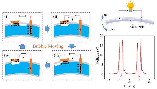 摩擦纳米发电机(TENG)可以有效地将机械能转化为电能,在环境能量收集和自驱动系统的应用中引起广泛关注。传统固-固摩擦纳米发电机(SS-TENG)由于存在界面磨损问题,其输出性能和使用寿命受到极大影响。另外,环境温度和湿度对其信号的稳定性和精度干扰较大。针对这些问题,本次工作利用气泡驱动固-液界面运动发电,有效弥补了固-固摩擦纳米发电机存在的这些缺陷。实验表明,B-TENG具有非常好的机械能收集能力,同时还可以作为自驱动传感器快速灵敏地检测水位高度。考虑到其结构简单、成本低廉、高稳定性和耐久性等优点,新型B-TENG有可能在环境能量收集和自供电系统中展现出较大的应用潜力。