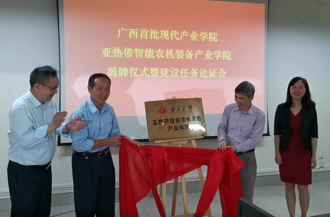 在揭牌仪式环节,尤晖院长代表学院致欢迎辞。教务处梁微副处长宣读教育厅下发的关于成立广西首批普通本科高校示范性产业学院的批文。自治区农业机械化服务中心副主任、二级巡视员江垣德作为与会嘉宾代表发表讲话。尤晖院长兼任现代产业学院院长,他与李尚平教授、陈保善教授和梁微副处长共同为产业学院揭牌。