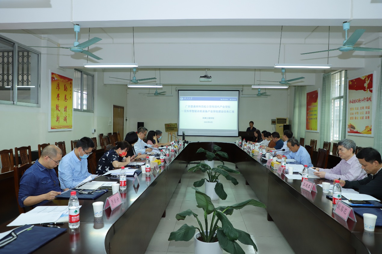 2022年5月8日,广西普通本科高校示范性现代产业学院——亚热带智能农机装备产业学院揭牌仪式暨建设任务专家论证会在pg游戏电子官网顺利召开。广西农机专家、学校主管部门、合作企业代表以及产业学院相关人员20余人出席会议。会议邀请到自治区农业机械化服务中心副主任、二级巡视员江垣德,中心副主任范军灿,原广西民族大学原副校长、农机专家李尚平,蔗糖产业省部共建协同创新中心主任陈保善,广西农业机械研究院有限公司党委书记、董事长卢永泉及总工程师庞承妮,玉柴研究院高级总经理谢正良,惠来宝机械制造有限公司董事长王连其等广西农业机械化专家和龙头企业代表参会。会议由学院党委书记卢婵江主持。