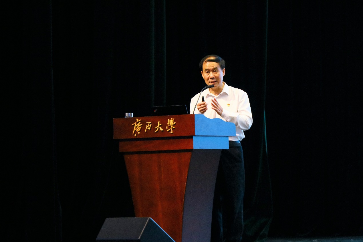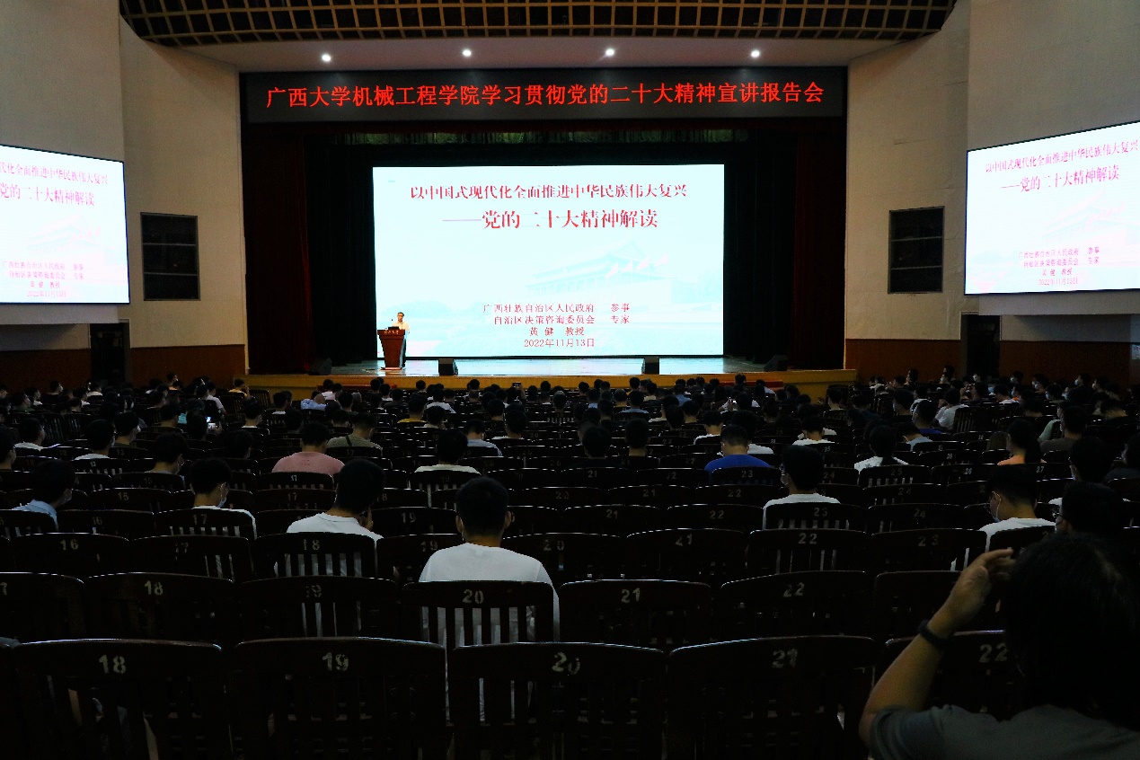 为引导全院师生深入学习贯彻党的二十大精神,11月13日晚,学院党委在pg游戏电子模拟器大礼堂召开学习贯彻党的二十大精神宣讲报告会。报告会邀请广西壮族自治区人民政府参事、自治区决策咨询委员会专家黄健教授作题为《以中国式现代化全面推进中华民族伟大复兴——党的二十大精神解读》的宣讲。全院师生党员及发展对象共四百多人参加报告会。院党委副书记黄路明主持报告会。