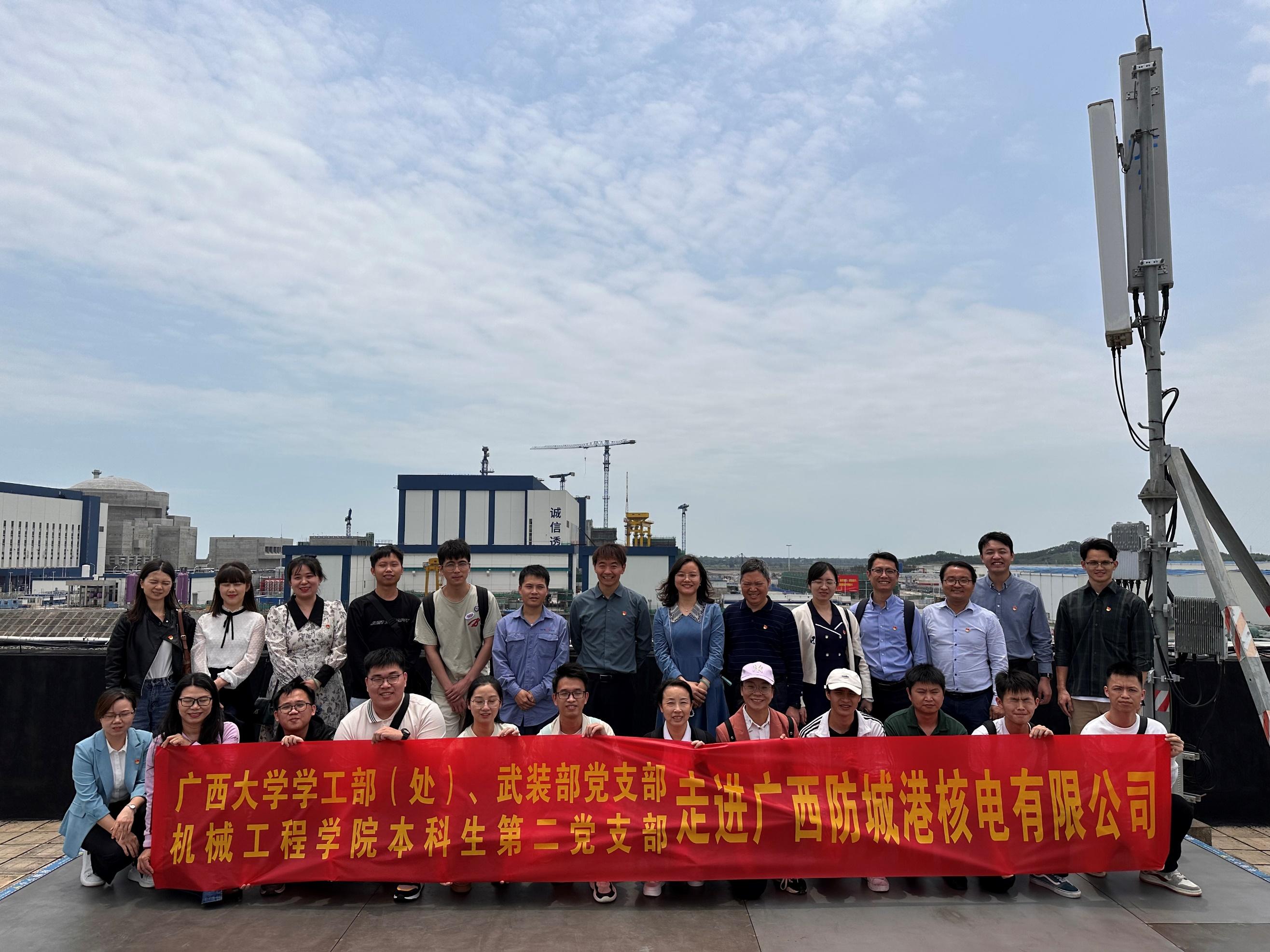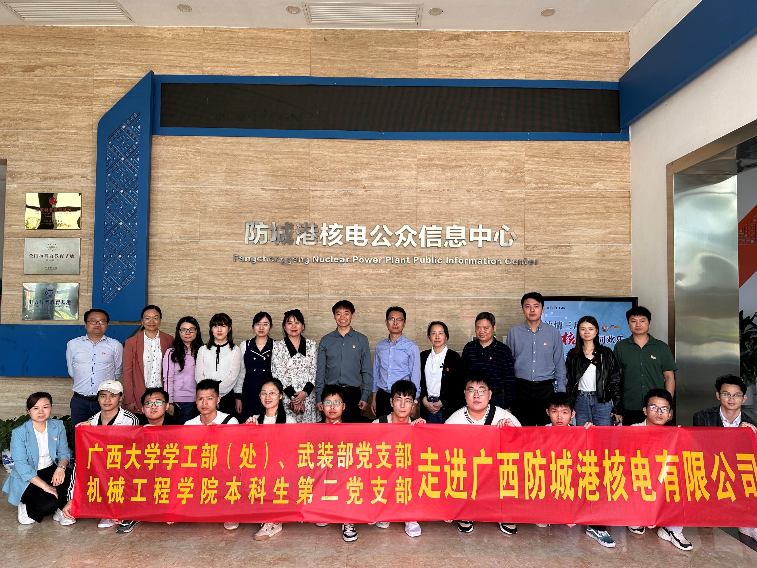 为贯彻落实党中央关于在全党大兴调查研究的工作要求,2023年4月26日,pg游戏电子官网本科生第二党支部与学校学工部(处)、武装部党支部在学校学工部(处)、武装部王利军副部(处)长的带领下,共同赴防城港中广核广西防城港核电有限公司开展支部共建活动。