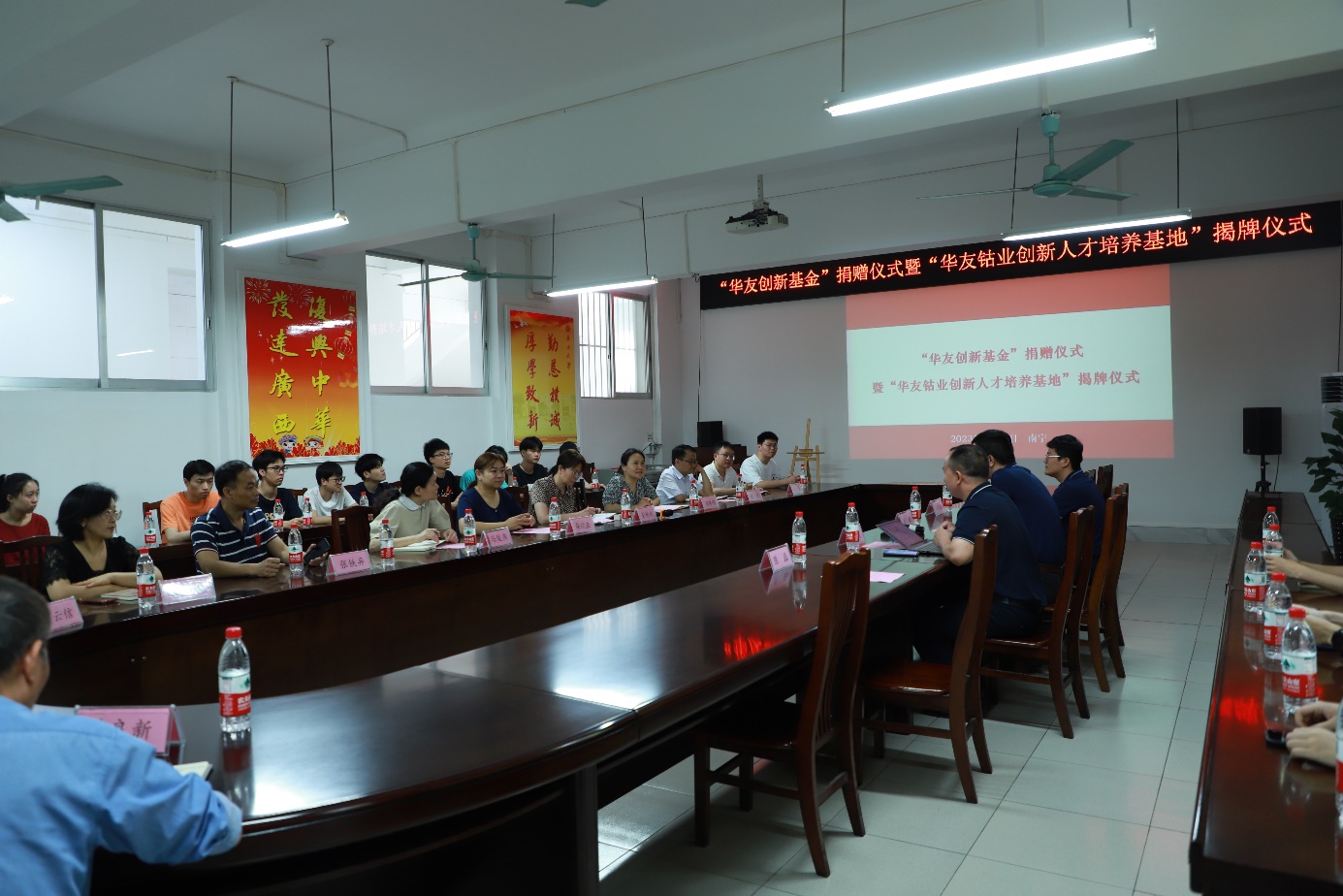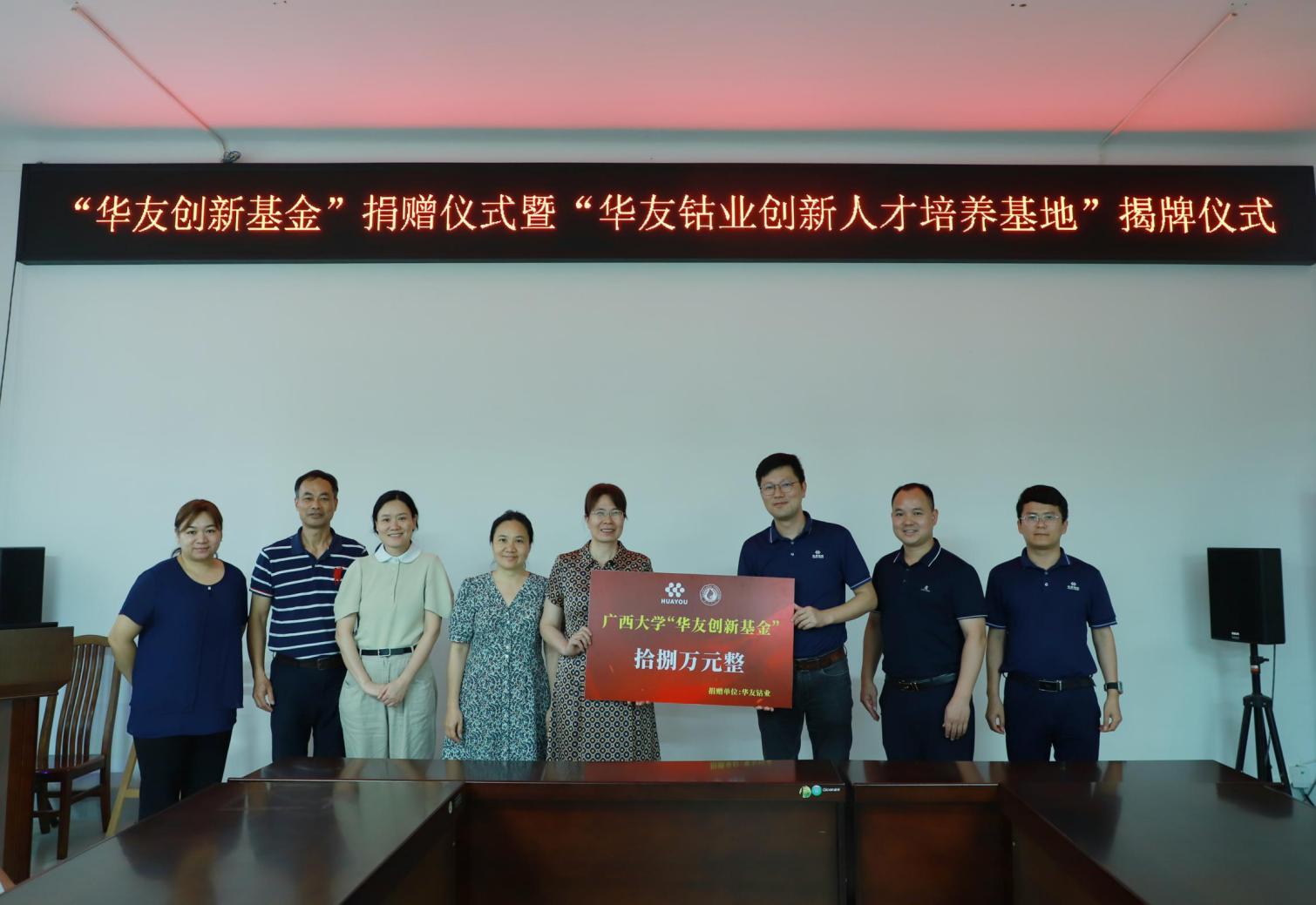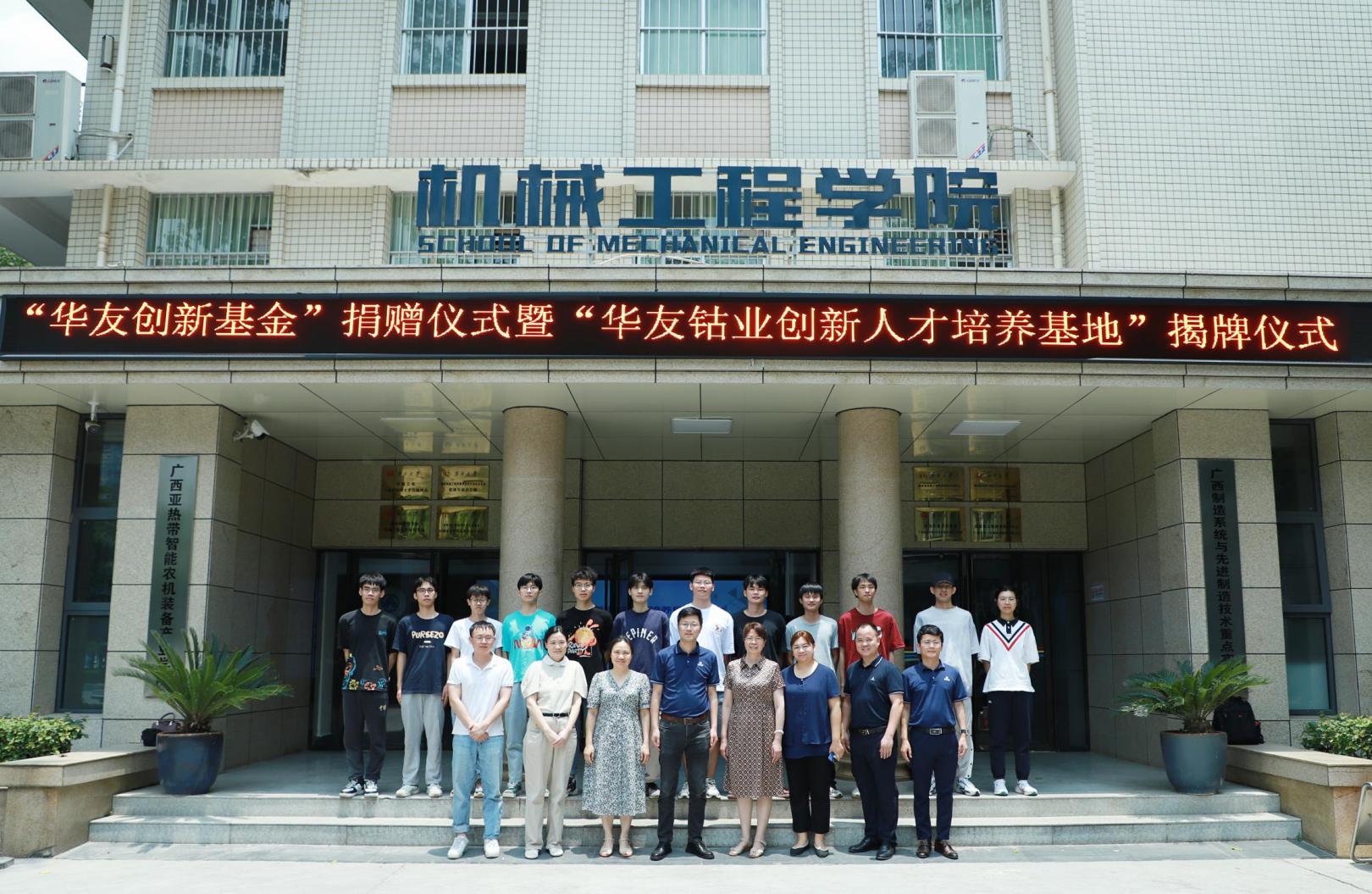 5月19日上午,浙江华友钴业广西华友工程项目管理有限公司人力资源中心总经理王敏一行到访pg游戏电子官网,与pg游戏电子官网领导和师生座谈交流,并共同举办“华友创新基金”捐赠仪式暨“华友钴业创新人才培养基地”揭牌仪式。仪式由党委副书记黄路明主持,学院常务副院长蒙艳玫、副院长高欲垚、学科竞赛指导老师马俊燕、张铁异以及学院全体辅导员出席仪式。