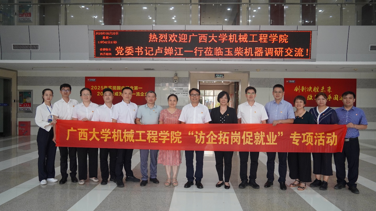为深入贯彻党中央、国务院关于高校毕业生就业工作的决策部署,推进访企拓岗促就业专项行动,全力促进高校毕业生高质量就业,5月22日,学院党委书记卢婵江、党委副书记黄路明、副院长贺德强、黄豪中、李俚、高欲垚,院长助理兼能源与动力工程系主任欧阳天成一行7人到玉柴机器研发总院走访调研,开展“访企拓岗促就业”专项活动。玉柴机器研发总院党委书记兼常务副院长寇传富,副院长兼新材料与摩擦润滑中心主任覃星念、党委副书记姜博、院长助理兼中重动力平台部主任向本杰、院长助理兼电控与智能化中心主任叶宇、轻动力系统部主任王春玲、运营管理部副主任周益善等参加调研活动。双方一同参观了玉柴机器集团位于南宁高新区的研发基地,详细了解企业的发展历程、生产经营现状、人才结构及关键技术攻关需求等方面的情况。在走访中,学院领导和老师积极向企业推荐pg游戏电子官网毕业生,了解企业的人才需求,深度了解企业对毕业生的知识、能力、素质要求,认真分析所在行业的发展趋势和人才需求形势,以作为不断增强人才培养的针对性和适应性的重要参考。