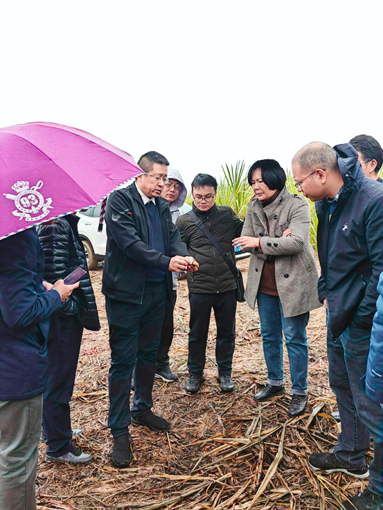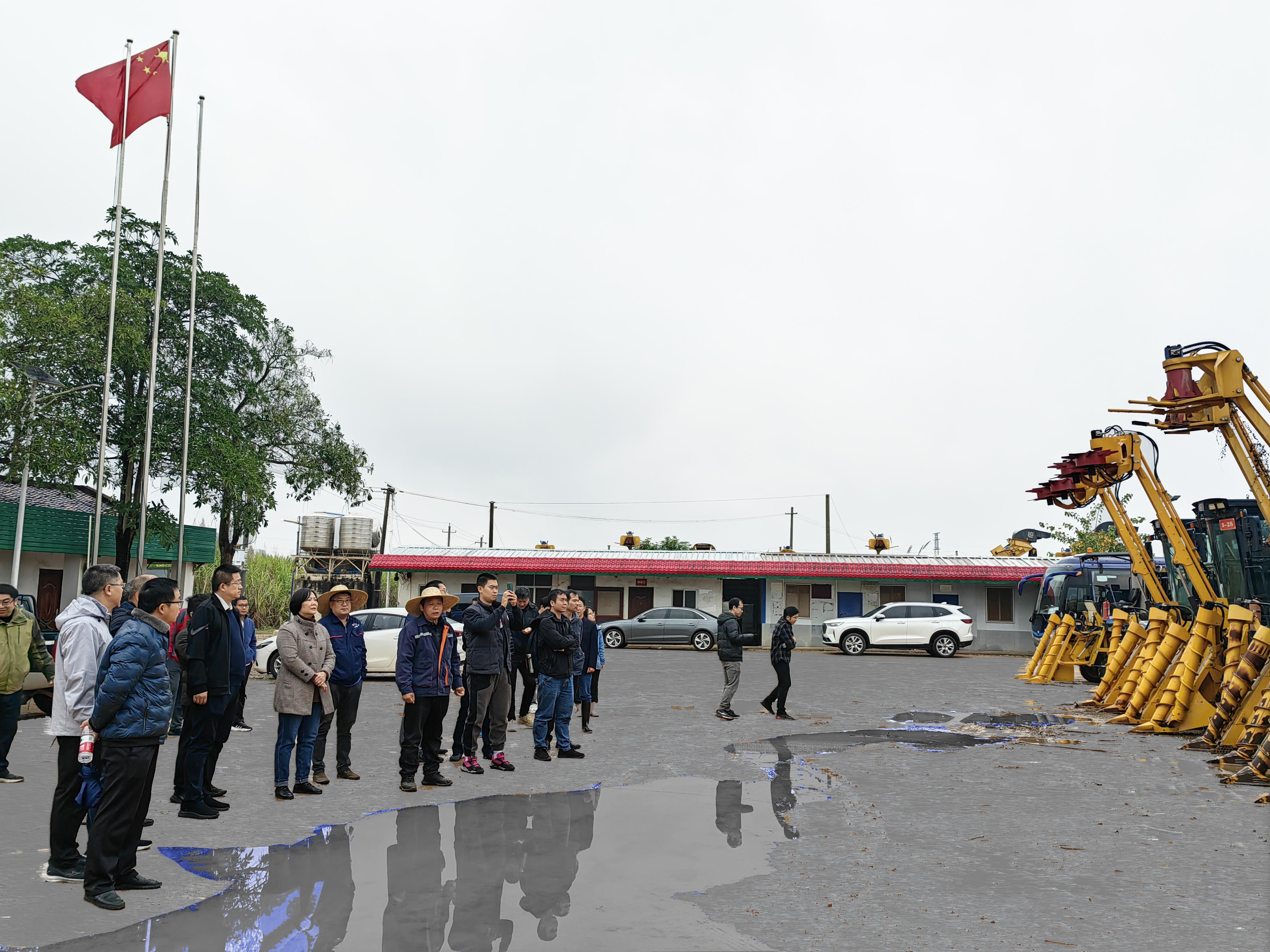 为加快推进亚热带智能农机装备现代产业学院(以下简称“产业学院”)工作部署,促进政校企深度合作,推进“政产学研用推”融合,1月12日上午,学院党委书记卢婵江一行20人赴扶绥开展调研,一同参加的还有自治区农机化服务中心、产业学院共建单位广西农业机械研究院有限公司和惠来宝机械制造有限公司相关负责人。在自治区农机中心鉴定站站长叶长青的带领陪同下,先后深入“甜蜜之光”隆田糖料蔗示范区、区农机中心试验鉴定工作站以及pg游戏电子官网农科新城科研用地进行走访调研,了解目前甘蔗收割机等装备应用情况、甘蔗生长情况及种植农艺、品种等。