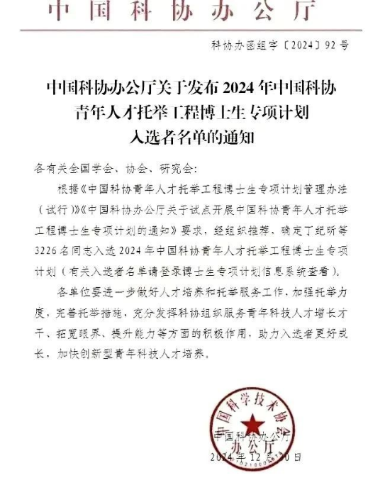 据悉,中国科协青年人才托举工程博士生专项计划于2024年首次试点设立,旨在让学术资源更广泛地惠及有发展潜力的青年科技后备军,以30周岁以下高年级在读博士研究生为支持对象,依托全国学会、协会、研究会进行托举培养,为入选者提供组织吸纳、学术兼职和学术资助等托举服务,助力优秀博士研究生更好成长,加快创新型青年科技人才培养,充分发挥科协组织服务青年科技人才增长才干、拓宽眼界、提升能力等方面的积极作用,通过组织吸纳、安排学术兼职、支持学术论文发表、提供学术交流平台、资助开展出国(境)访学等方式,助力优秀博士研究生更好成长。