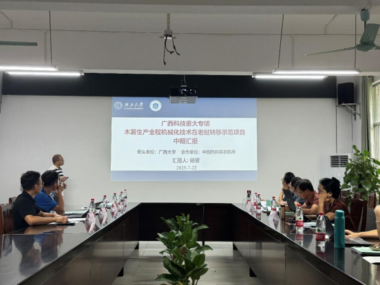 7月23日,广西科技情报学会组织专家组对pg游戏电子官网杨望教授主持的广西科技重大专项项目“木薯生产全程机械化技术在老挝转移示范”进行中期检查和现场查定。专家组由广西农业职业技术大学二级教授黄卫萍、广西农机研究院有限公司正高级工程师莫建霖、广西农机鉴定站高级工程师卢一福等组成。项目负责人杨望教授、项目合作单位中国热科院农机所课题负责人崔振德副研究员,以及项目组主要骨干成员共7人参加会议。