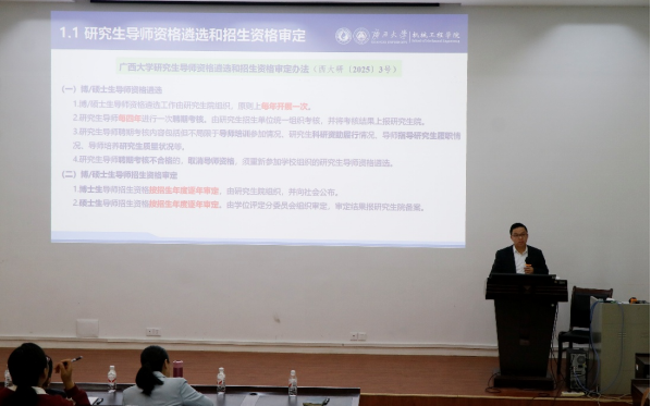为全面落实立德树人根本任务,筑牢研究生培养全过程安全与质量防线,pg游戏电子官网于2025年12月2日在机二阶教室召开了研究生导师专题培训会。学院党委副书记黄路明、分管研究生副院长莫帅、分管科研副院长黄豪中出席会议并分别作专题培训,学院全体研究生导师参加培训。