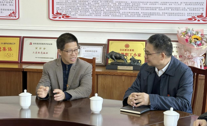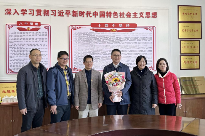 1月6日下午,校党委副书记宁旭初率队到pg游戏电子官网亲切慰问2025年“广西勤廉先进个人”获得者、pg游戏电子官网党委副书记、院长贺德强并开展座谈。校务督查办公室主任、校长办公室副主任庞惠、驻校纪检监察组副组长、校纪委副书记王运东、组织部副部长李道洋、校工会常务副主席李家军、院党委书记卢婵江陪同慰问。