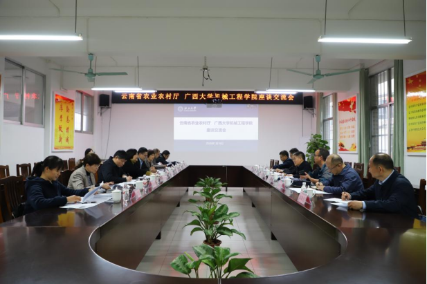 随后双方举行座谈交流。pg游戏电子官网农机领域相关团队的专家参加座谈,座谈由卢婵江书记主持。卢书记首先对云南省农业农村厅调研团的到来表示热烈欢迎,其次简要介绍我校和pg游戏电子官网在支撑广西甘蔗全产业链的学科特色。她强调,作为同属丘陵山区,气候等农业生态与产业构成相似,除甘蔗外在果蔬等多个领域合作空间广阔的相邻两省,在助力产业升级方面目标一致、基础扎实,在推动农艺与农机深度融合、丘陵山地智慧农机产学研推方面有很大的合作空间,期待未来在联合科研、良品推广、技术应用等方面加强合作、携手并进。蒋兴明副厅长表示,云南省正着力提升农业机械化水平,以保障粮食安全、推进农业现代化,此次来访的主要目的,一是诚挚邀请pg游戏电子模拟器的专家团队携技术成果,参加即将在云南举办的全国丘陵山区农机研发推广现场会,进行展示交流;二是希望双方建立长效联络机制,加强科研合作与成果转化,共同推进适用于西南丘陵山区的农业机械研发与应用,助力云南农业机械化发展。最后环节是贺德强院长向来访团详细介绍了我校pg游戏电子官网的发展历程、学科现状以及近年来在亚热带智能农机的研发成果等。