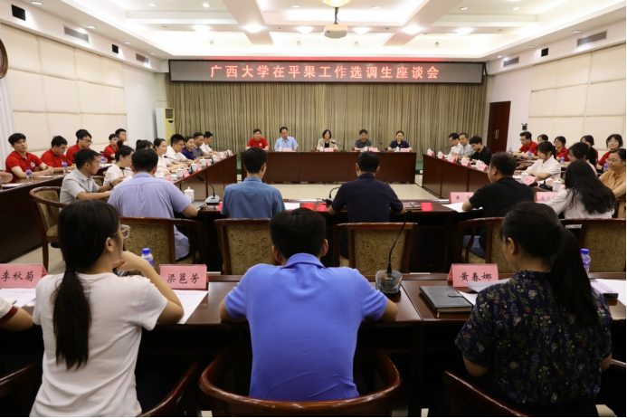 校学工部副部长王利军,校友办副主任黄庶冰,学院党委书记卢婵江、副书记黄路明、副院长黄豪中、莫帅、陈宏波、全国党建样板支部书记邓建新等30多名师生党员参加活动。平果市委常委、组织部部长黄瑞华、副部长张飞,那坡县委常委、组织部部长梁安忠、副部长黄波、妇联主席蓝靖月,以及我校在平果市和那坡县工作的十多名选调生代表出席座谈会。