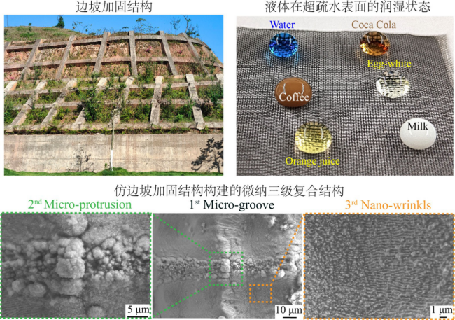 论文的第一作者为pg游戏电子官网助理教授刘黎明,通讯作者为尤晖教授,pg游戏电子模拟器是论文的第一署名单位。该论文受山体“边坡加固”结构的(如图1所示)启发,在金属表面构建了具有超疏水润湿特性的三级尺度微纳金属网膜结构,进而开发出一种机械强度大、耐久性强的新型超疏水多孔膜基材料,成功突破了上述技术瓶颈。实验表明,这种材料的超疏水微纳结构具有类荷叶的自清洁功能,可抵抗生活中常见的液体如水、可乐、咖啡、鸡蛋清液、果汁和牛奶等的润湿,具有优异的防污能力。更重要的是,面对水射流冲击,2000次循环摩擦,400℃高温处理以及1.6吨汽车碾压等严苛机械测试后,仍具有自清洁能力。此外,该超疏水金属网膜具有油相/水相选择超浸润特性,可自动“识别”油相或水相选择性通过(如图2所示)。这种材料表面的高强度三级微纳结构有望克服油水分离技术中,由于液体高速冲击而导致涂层与基底脱离的缺点,在自清洁和油水分离应用领域具有重大应用价值。