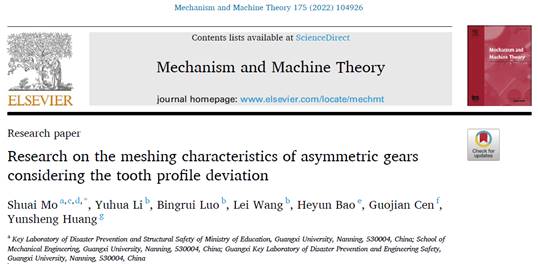 莫帅教授团队在顶级期刊国际机构学与机器科学联合会(IFToMM)会刊《Mechanism and Machine Theory》(双一区,TOP期刊)上发表研究成果“Research on the meshing characteristics of asymmetric gears considering the tooth profile deviation”。该成果以pg游戏电子模拟器工程防灾与结构安全教育部重点实验室为第一单位及通讯单位,莫帅教授为第一作者兼通讯作者。