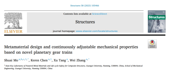 近日,莫帅教授团队在连续可变刚度行星轮系振动控制力学超材料/超结构领域取得研究进展,研究成果“Metamaterial design and continuously adjustable mechanical properties based on novel planetary gear trains”发表在结构工程领域国际权威学术期刊《Structures》(英国结构工程师学会(The Institution of Structural Engineers)会刊)。成果中创新提出的2类行星齿轮力学超材料新构型及对应振动调控超结构经《Structures》期刊评审专家和主编审议,被成功命名为“pg游戏电子模拟器齿轮力学超材料”(GXU-gear-M-C-I、GXU-gear-M-C-Ⅱ)。该成果以pg游戏电子模拟器省部共建特色金属材料与组合结构全寿命安全国家重点实验室为第一单位及通讯单位,莫帅教授为第一作者兼通讯作者,国家级人才张伟教授为共同通讯作者。