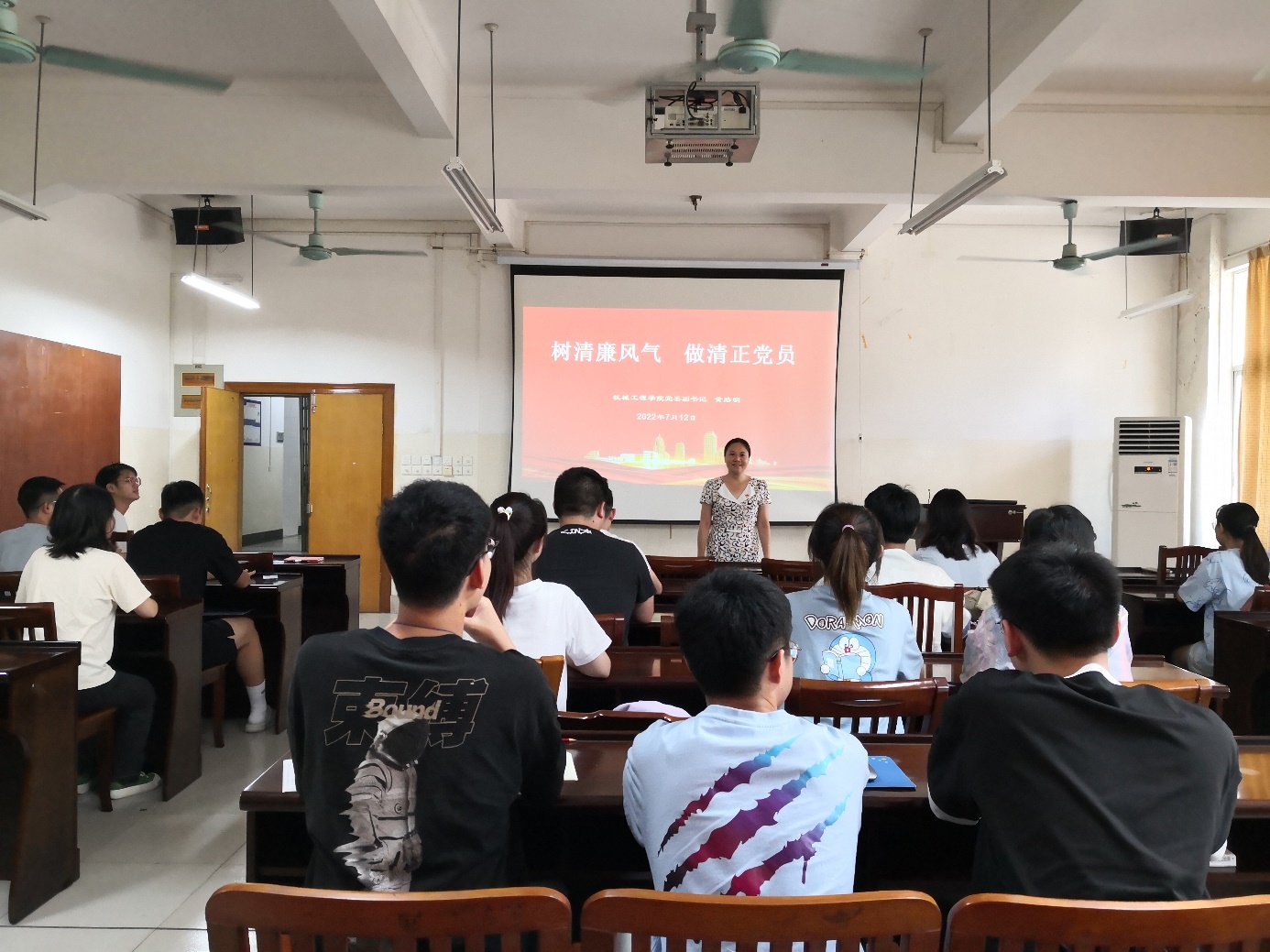 2022年6月12日下午,pg游戏电子官网本四支部召开支部大会。特邀学院纪委书记黄路明给大家上“清廉西大”的党课。